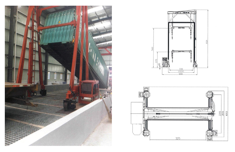 該車是專為傾倒集裝箱內(nèi)貨物(包括液體、零散固體等),該機(jī)可使20尺集裝箱的傾斜角度達(dá)到42度,40尺集裝箱的傾斜角度達(dá)到24度。